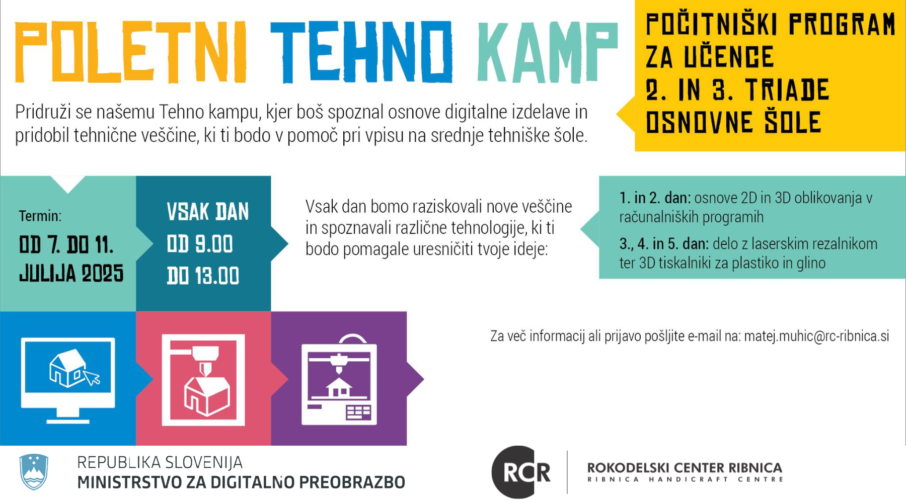 POLETNI TEHNO KAMP Ustvari, oblikuj in programiraj svojo idejo! Pridruži se nam na 𝗽𝗼č𝗶𝘁𝗻𝗶š𝗸𝗲𝗺 𝗧𝗲𝗵𝗻𝗼 𝗸𝗮𝗺𝗽𝘂 v Rokodelskem centru Ribnica, kjer boš spoznal osnove digitalne izdelave in pridobil tehnične veščine, ki ti bodo prišle prav pri vpisu na srednje tehniške šole.